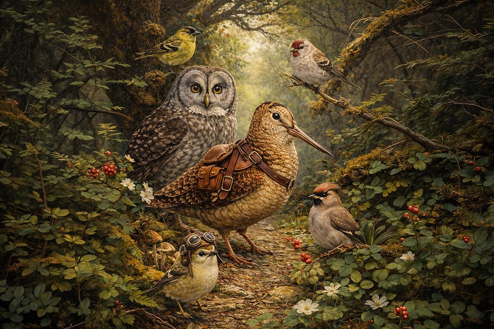 Reggie and Rusti joined the Baba Yaga laughing and dancing, happy she had solved their quandary and even happier they had not been turned into bones. The little Goldcrest was going to pilot the Woodcock all the way south to overwinter in the UK and the two birds stayed up all night making plans for their migration. The next morning at first light Reggie climbed on Rusti’s back and the pair took off for home. Rusti was soon soaring high above the forest canopy and the pair of intrepid travellers could see the fell thanks to Reggie’s expert navigation.